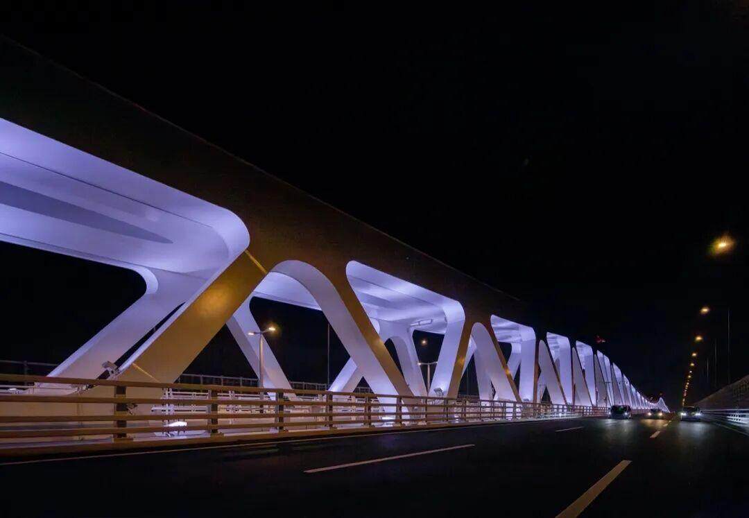 大桥夜景照明设计与自然浑然相融,巧妙融入人文关怀与社会责任理念,让大桥化身为承载温情的象征,成为点亮人心的光影纽带。夜景灯光变化模拟呼吸频率以表现潮汐中生命体的律动;同时以低能耗技术与精准配光方案,营造出月光洒海般雅致静谧的氛围。